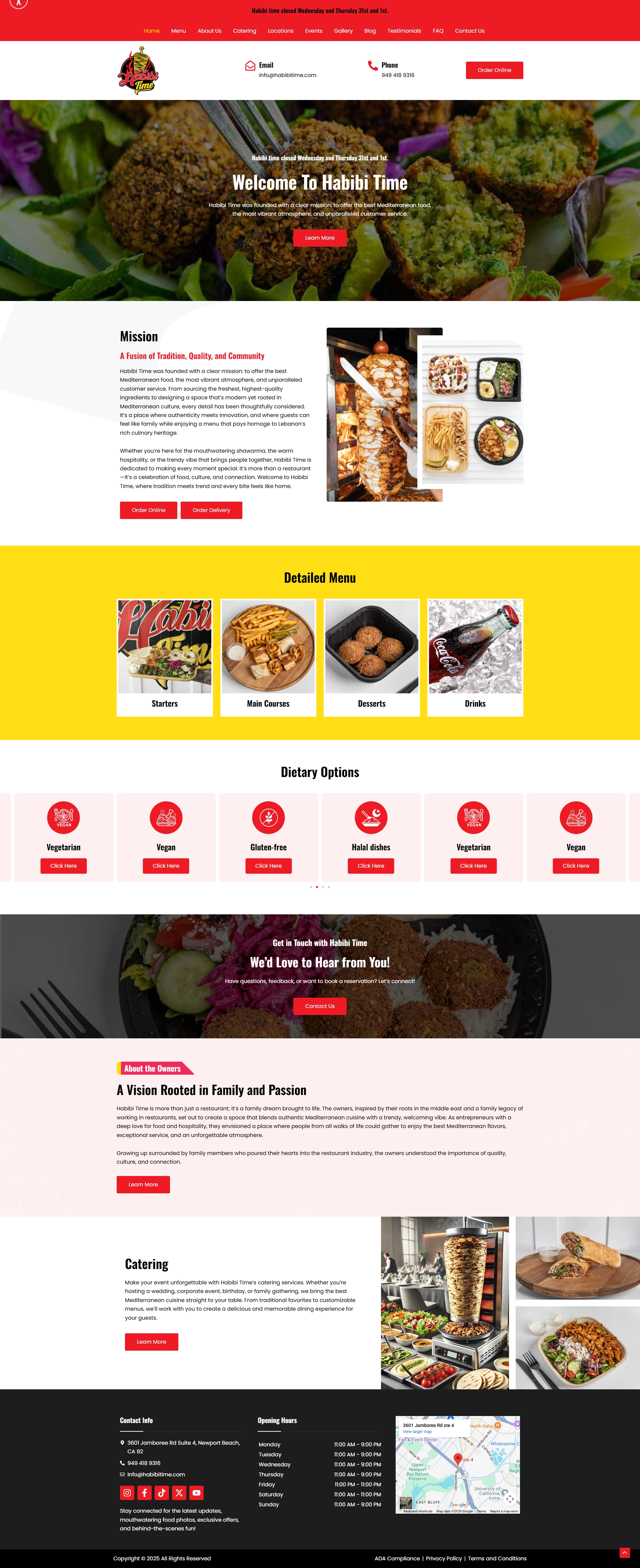 Habibi Time is a dynamic, visually engaging website designed to highlight the restaurant’s menu, culture, and dining experience. The platform emphasizes ease of use, fast performance, and mobile responsiveness, ensuring customers can explore menus, place reservations, and access contact information seamlessly. With a clean design, intuitive navigation, and SEO-ready structure, the website effectively positions Habibi Time as a go-to local dining destination while reflecting the brand’s personality and culinary offerings.